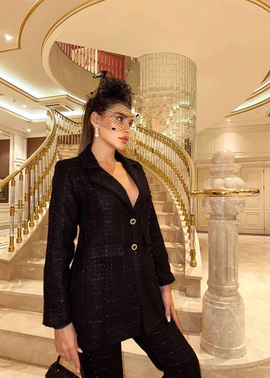 Linia curată a jachetei și croiala modernă a pantalonilor creează un look șic și încrezător. Punctul culminant este dat de voaleta stylish, care adaugă un farmec misterios și hollywoodian, transformând costumul într-o declarație de stil.