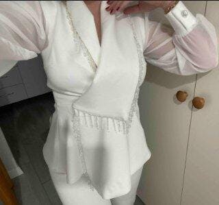 Croială Artistică: Sacoul are un design wrap petrecut, cu o croială peplum care definește spectaculos talia și flatează silueta. Pantalonii, cu croială largă și fluidă, completează setul, asigurând o mișcare elegantă și alungind vizual picioarele.