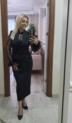 Fuziune de Stiluri: Croiala inovatoare combină un corp tip vestă/sacou, cu revere elegante și o centură care definește talia, cu o fustă midi tip creion. Această bază structurată este contrastată de mânecile transparente din dantelă fină, care adaugă o notă senzuală.