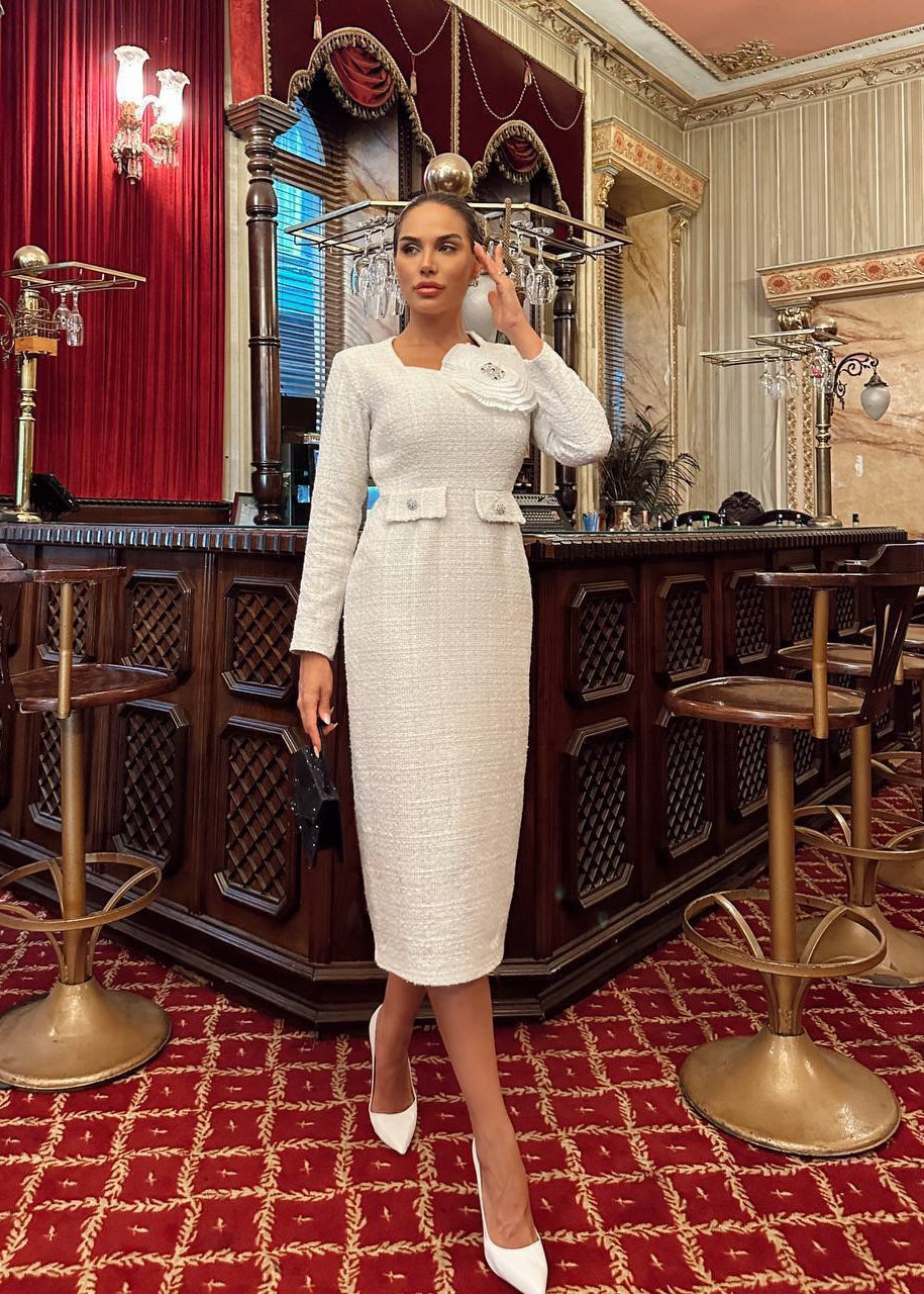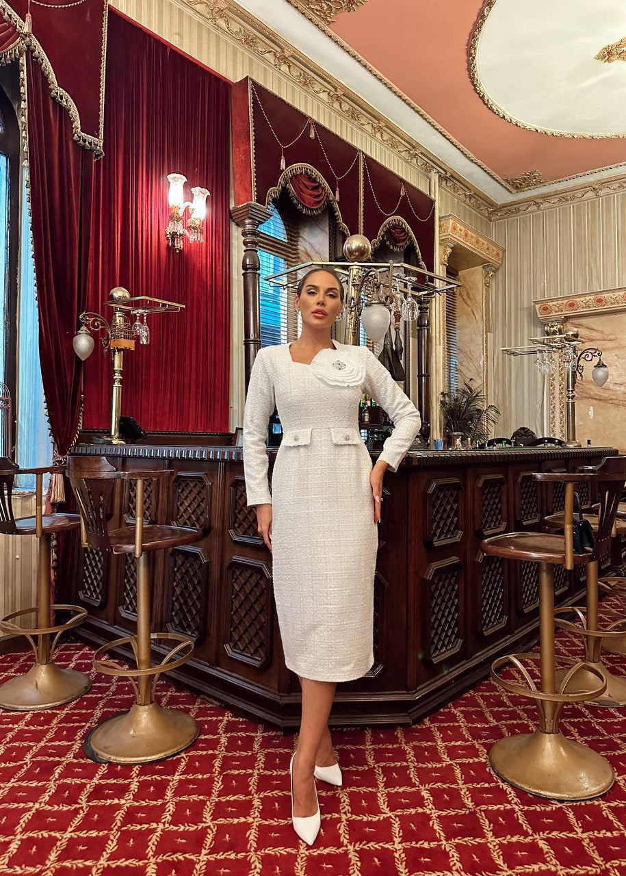 Textură Clasică: Realizată dintr-un tweed negru premium, cu inserții subtile care îi conferă profunzime, rochia îmbină structura cu finețea. Croiala midi, tip creion, subliniază silueta într-un mod elegant și profesionist.