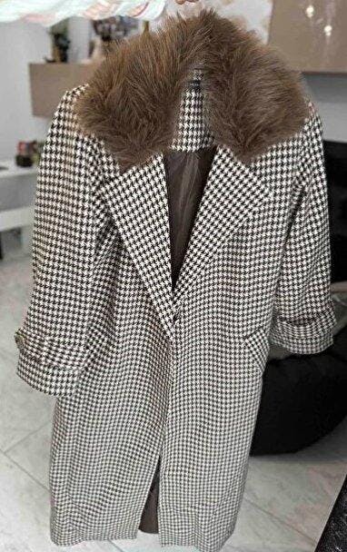Design Iconic: Paltonul are o croială midi sau lungă, care conferă o siluetă elegantă și structurată. Este realizat dintr-o stofă cu imprimeu houndstooth (sau pied-de-poule), un model clasic care asigură un aspect vizual bogat și atemporal.