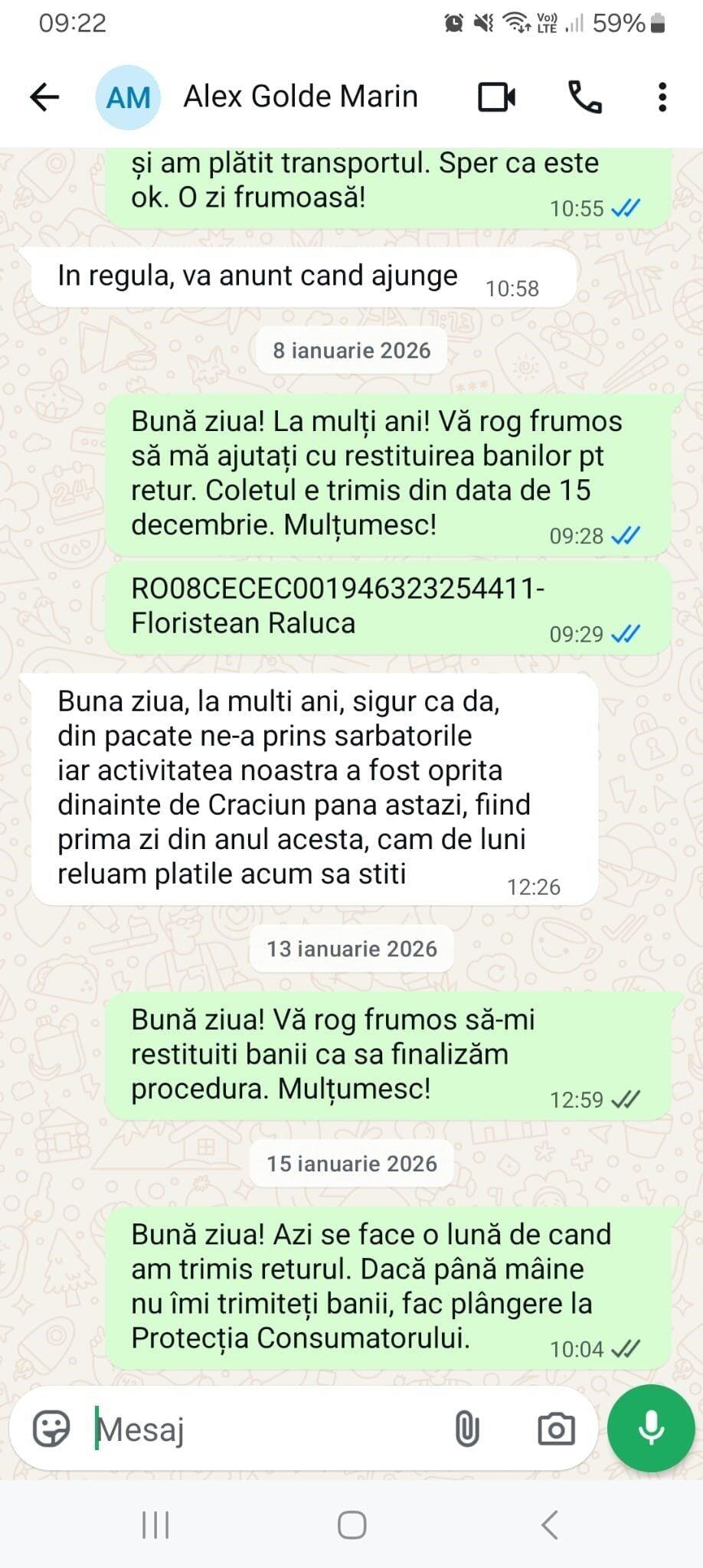 Contravaloarea produselor returnate va fi rambursată în cel mult 14 zile calendaristice de la data primirii returului și verificării produselor.