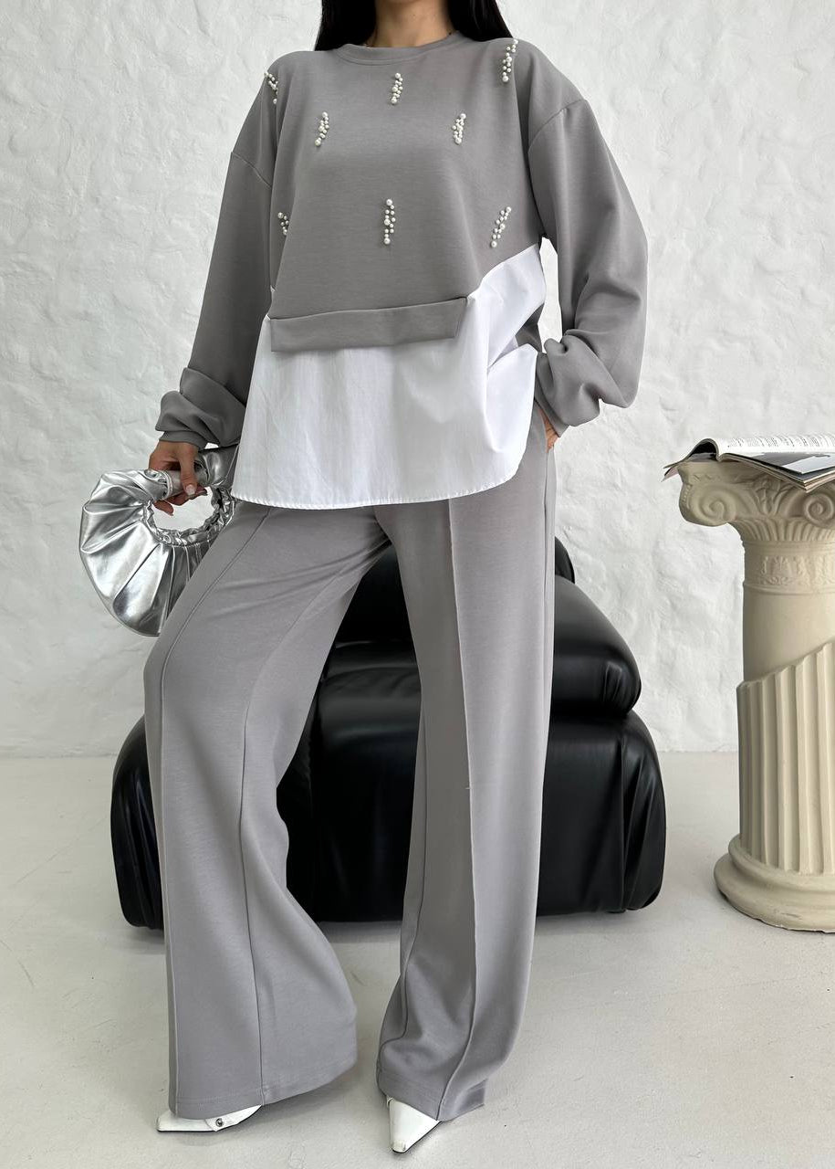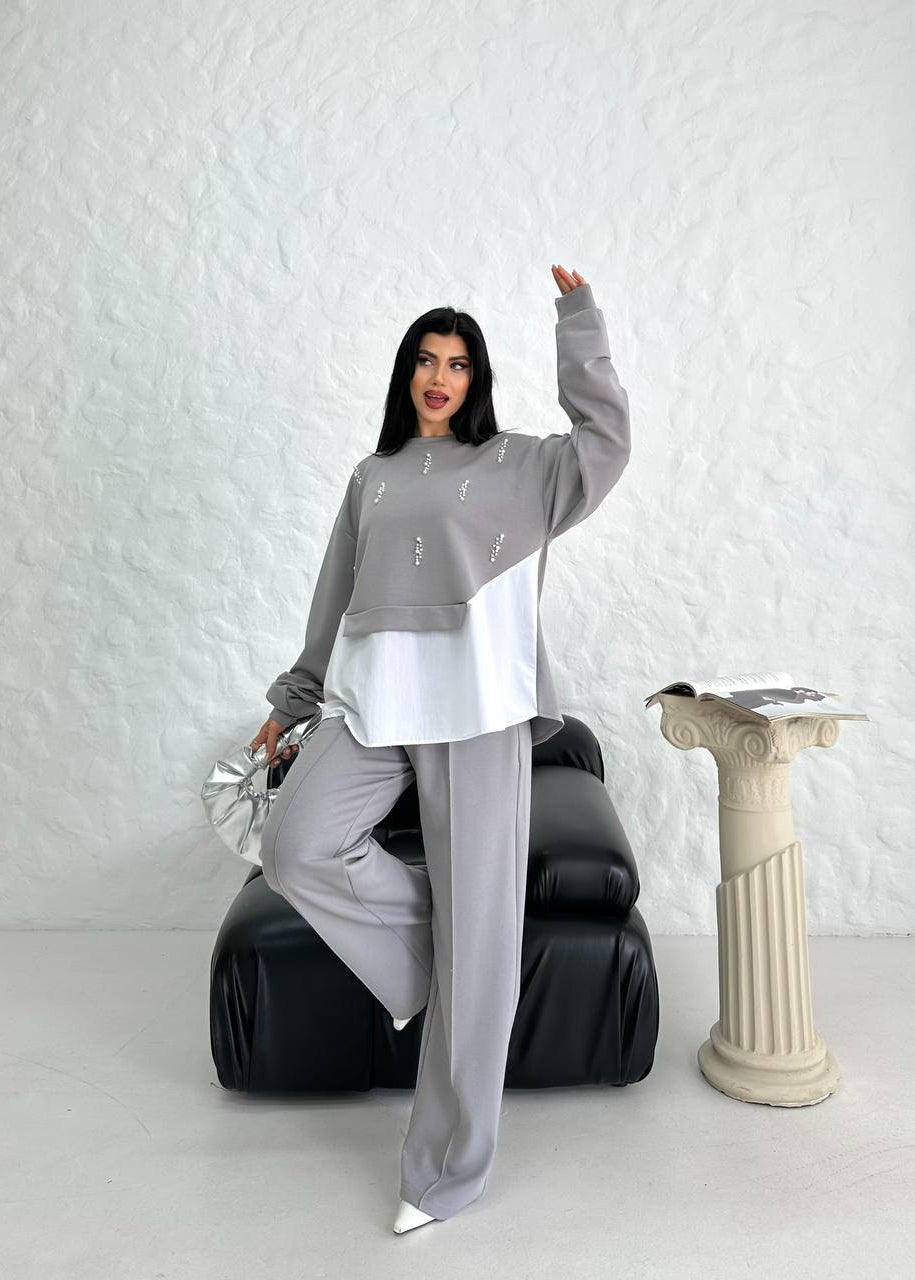Silueta: Croiala este structurată, cu pantaloni wide-leg (largi) care cad impecabil și creează o alură alungită și modernă. Treningul include și o cămașă albă, lungă, care iese de sub hanoracul crop, adăugând un efect de stratificare (layering), sofisticat și statement.