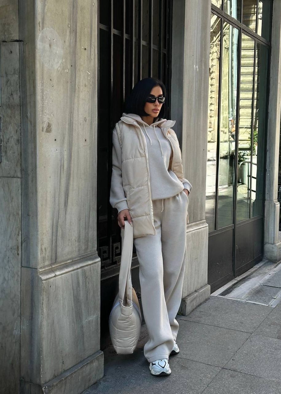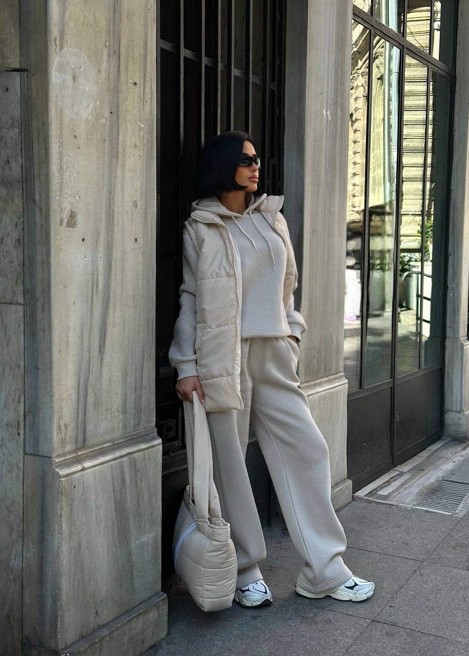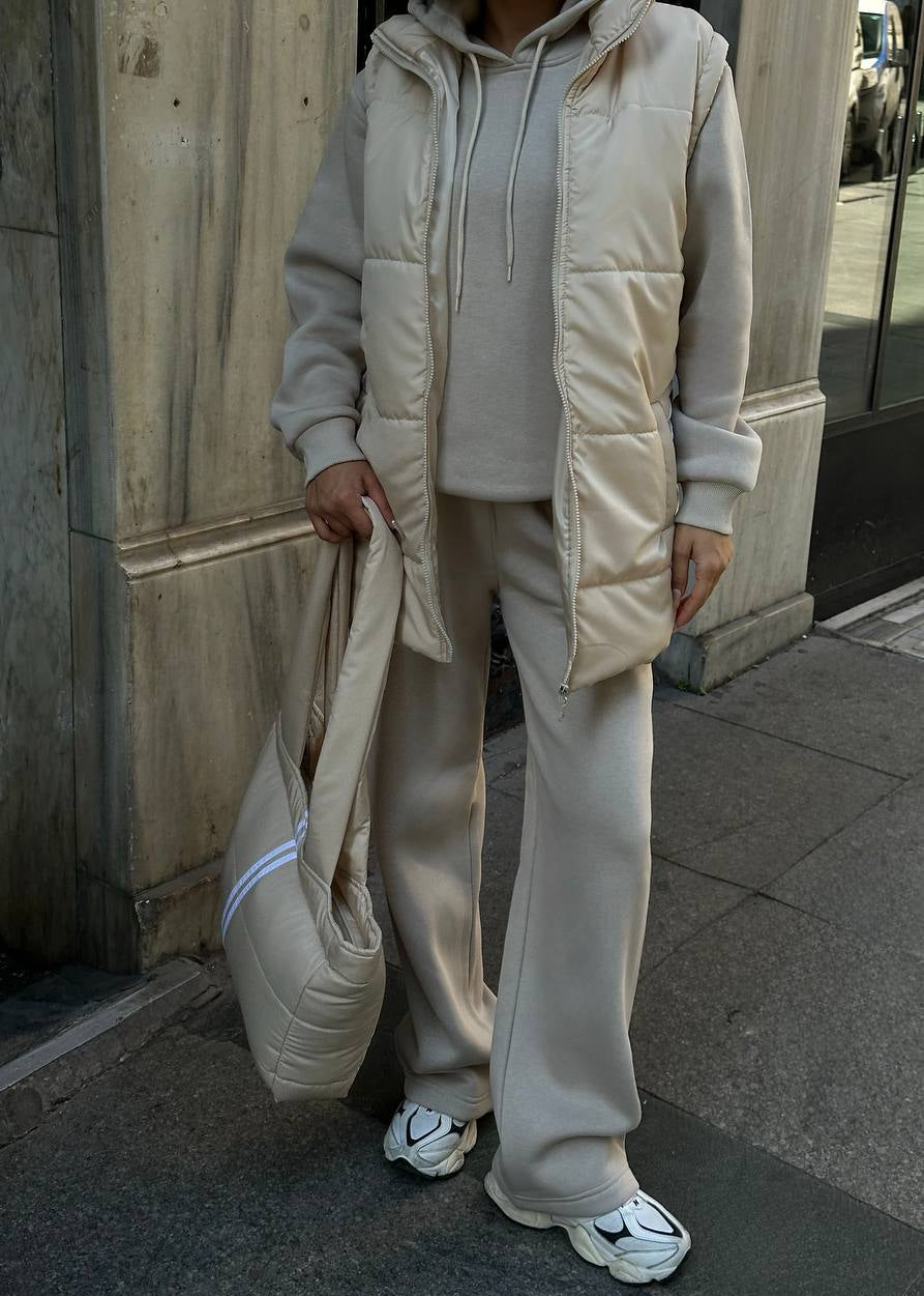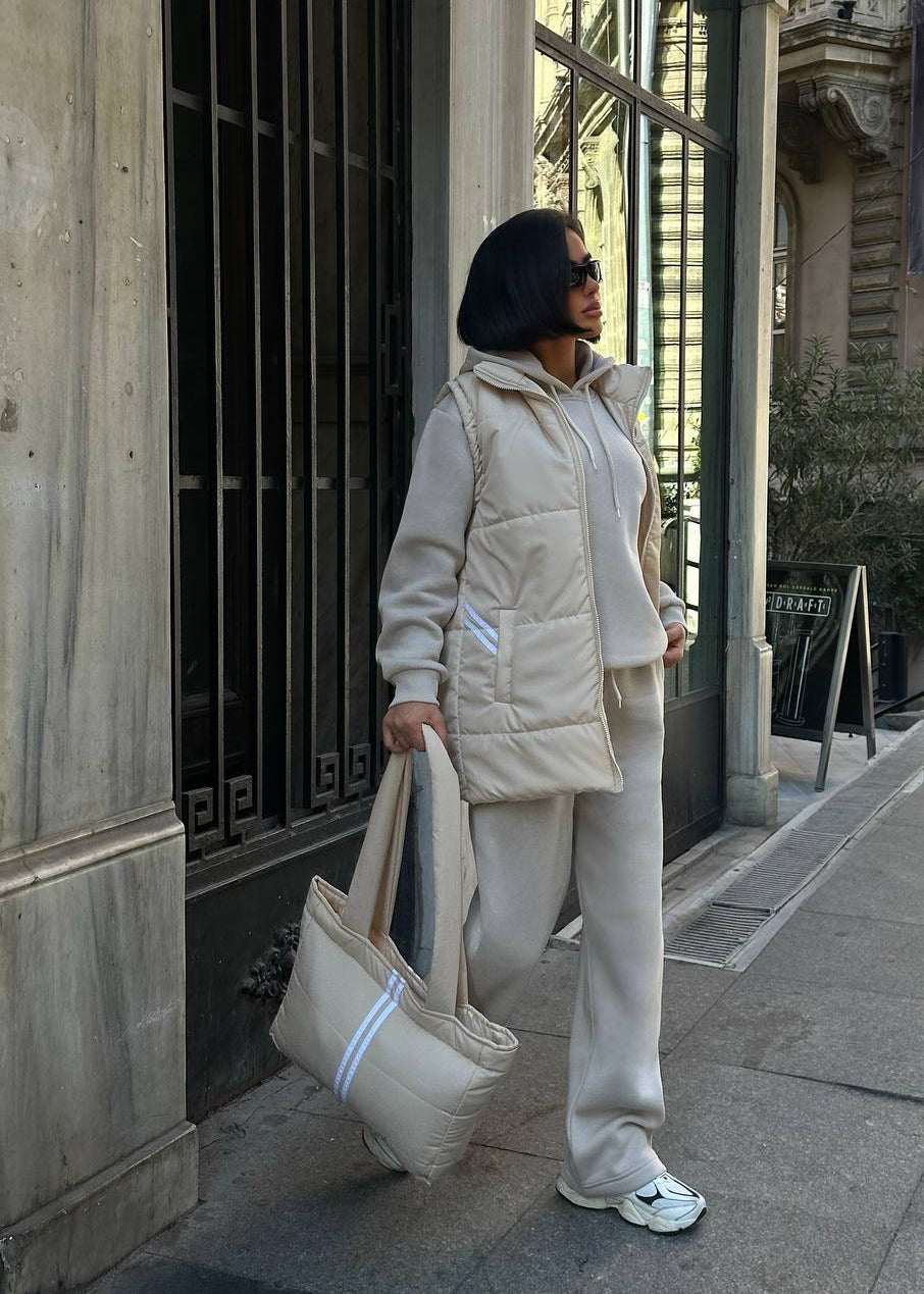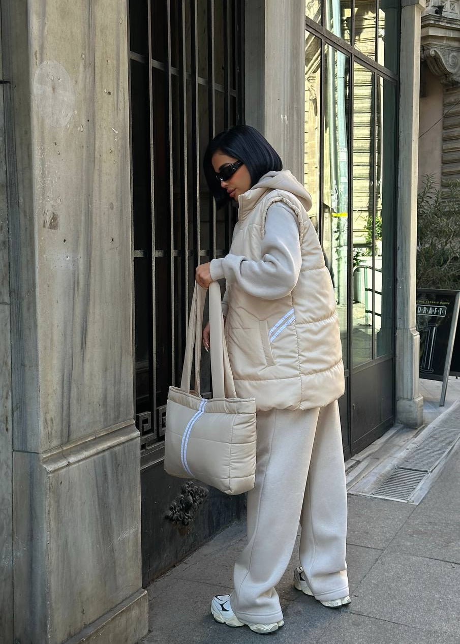 Atitudine și Funcționalitate: Fiecare piesă este realizată din materiale premium care asigură confort și rezistență. Textura matlasată a vestei și a genții adaugă un element de design modern. Croiala oversized a treningului asigură un vibe relaxat, dar statement.