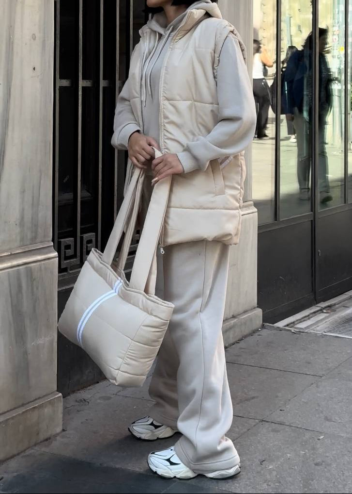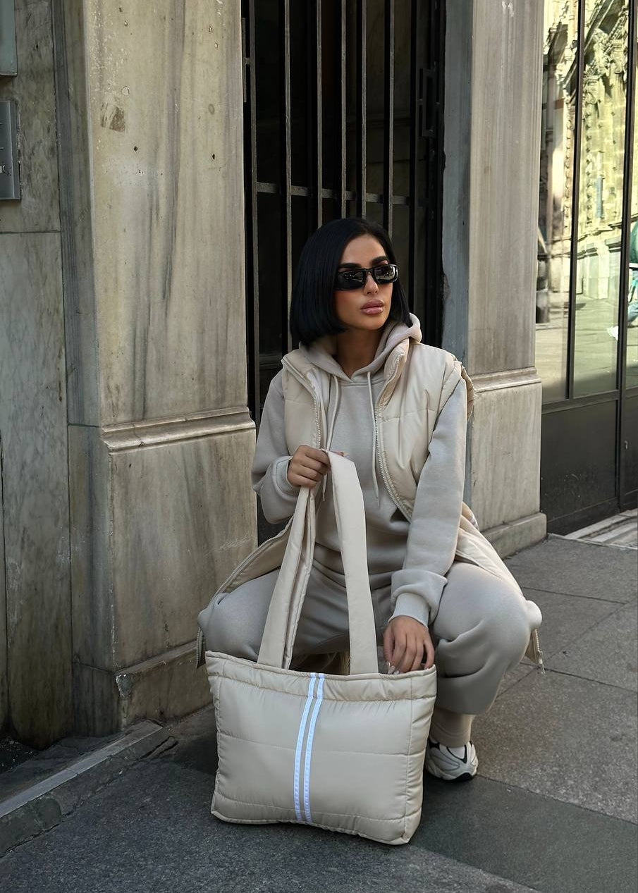 4. Geantă Asortată: O geantă tip puffer care completează perfect estetica setului.