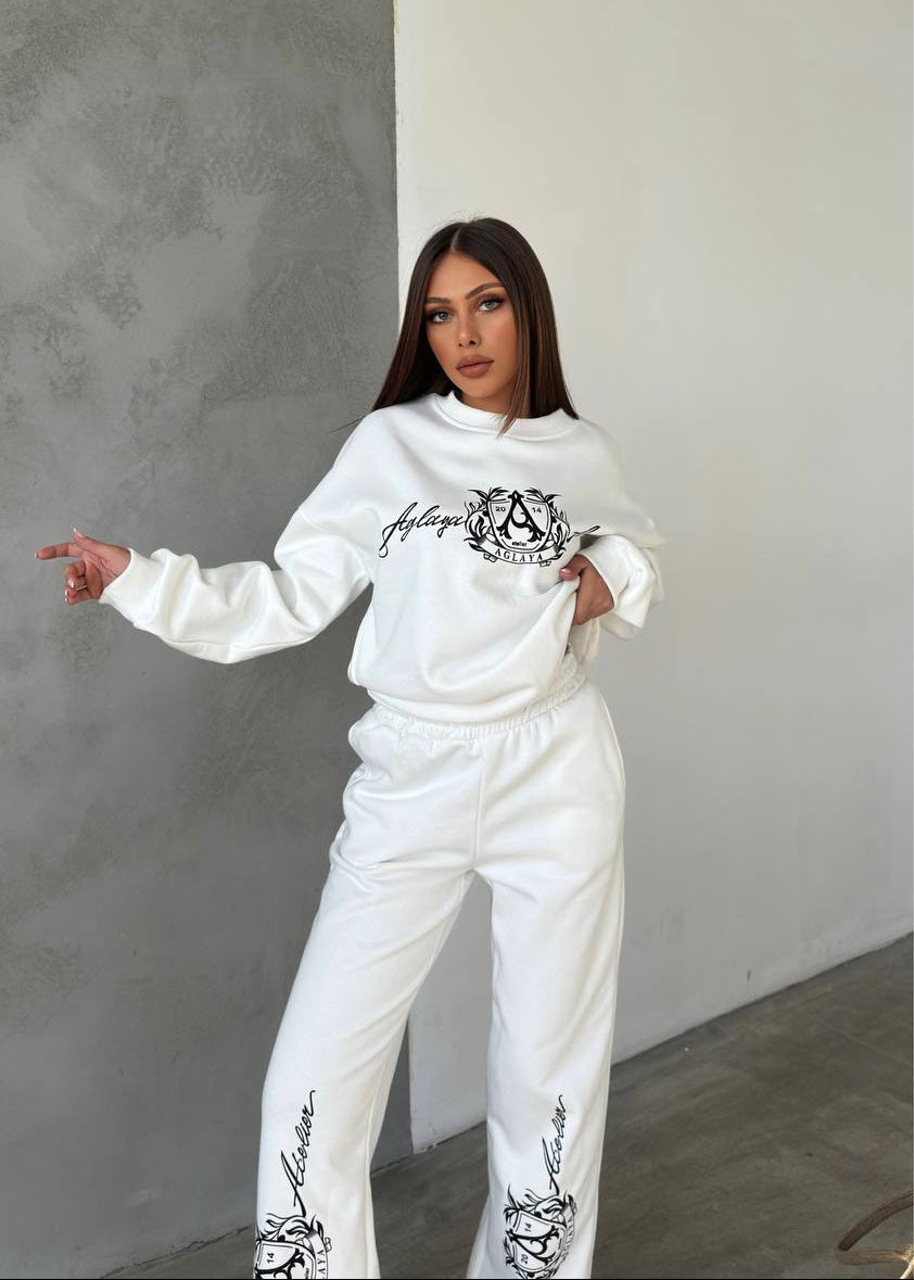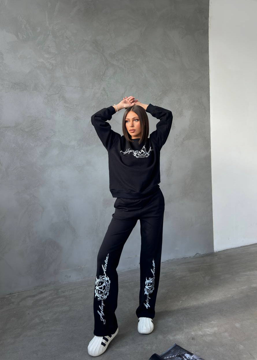 Pantalonii: Croiți lejer, cu o potrivire modernă, pantalonii se remarcă prin detaliile grafice repetate pe picioare, care completează perfect estetica de lux urban.